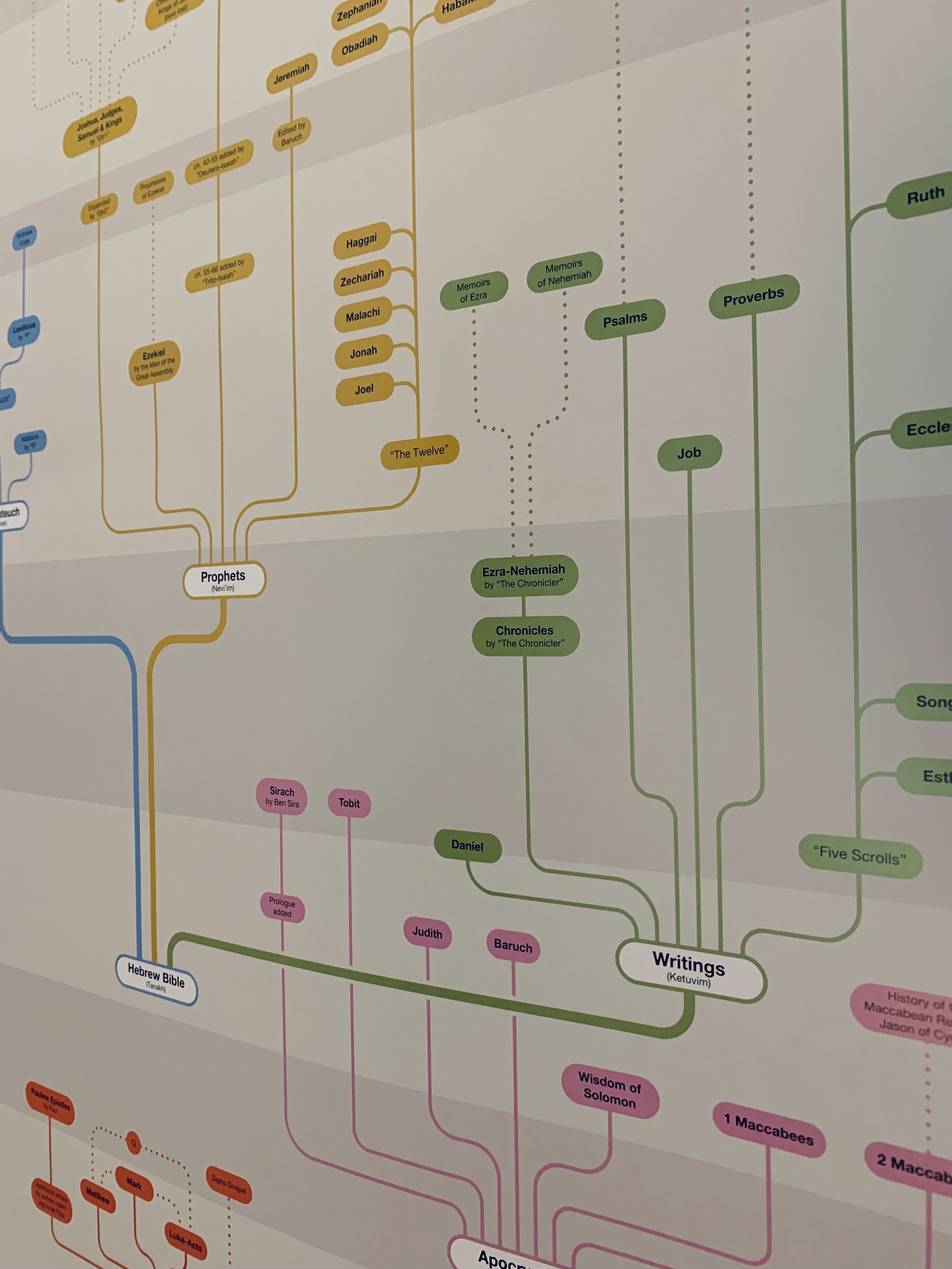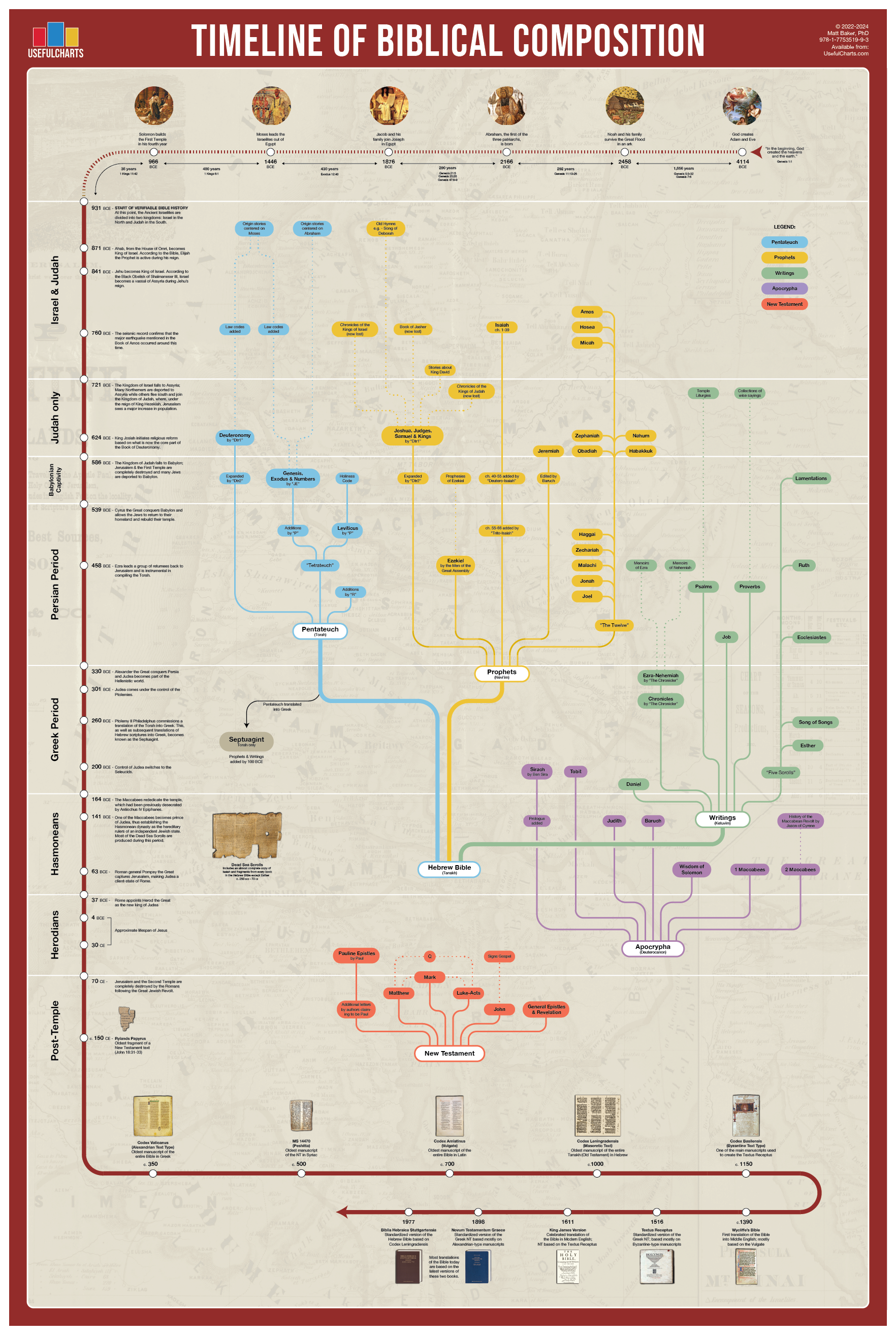 This poster illustrates the estimated time periods when each biblical book was authored, based on contemporary scholarly research, and reveals how these individual texts were ultimately compiled into the Bible as we know it.