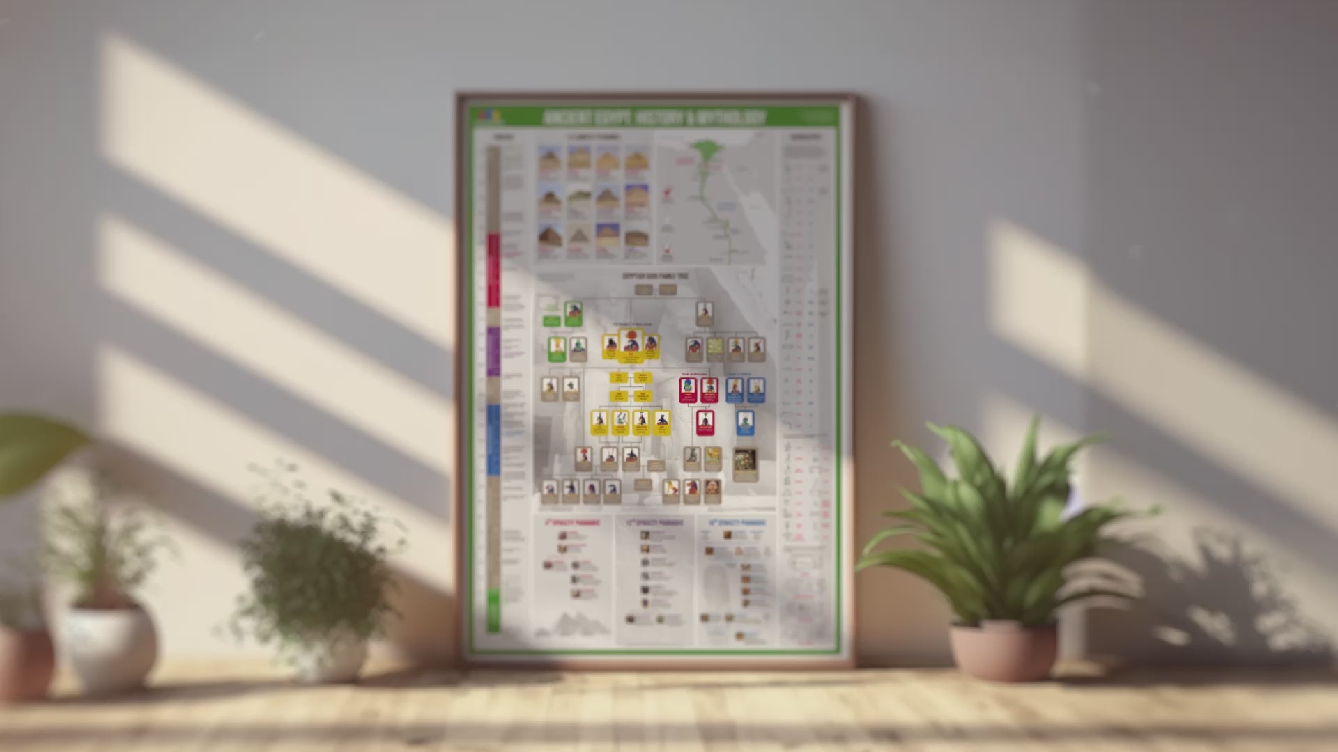 Explore Ancient Egypt with this detailed poster featuring a timeline, a geographic map, a hieroglyphs guide, and family trees of both gods and pharaohs. Perfect for history enthusiasts and learners alike.